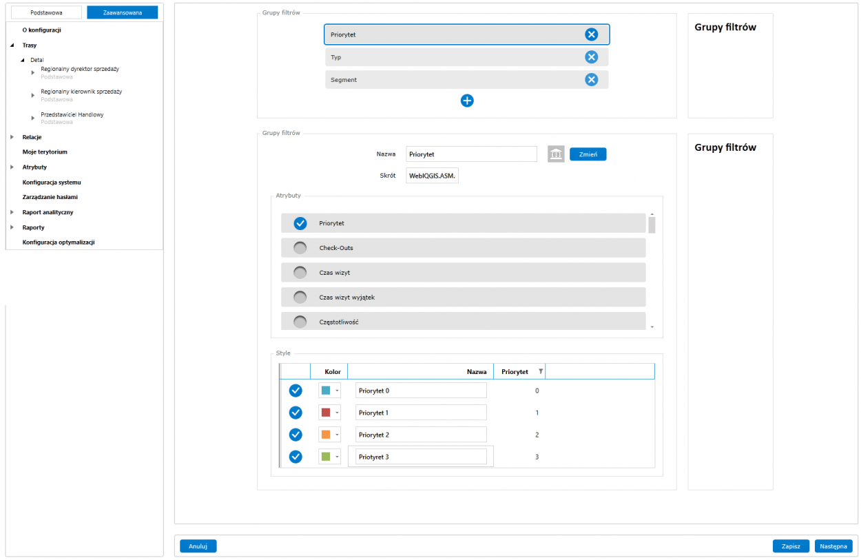 - Ustawienie filtrów — w zależności od wcześniej zaimportowanych danych istnieje możliwość utworzenia na ich podstawie filtrów, które ułatwiają rozróżnienie typów klientów np. sieci sklepów.